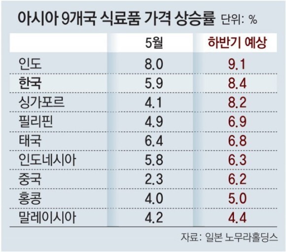 한국 식료품 물가가 올 하반기(7∼12월)에 8.4% 상승할 것이라고 일본 최대 증권사 노무라홀딩스가 전망했다. 특히 한국의 식료품값 폭등세가 아시아에서 인도에 이어 두 번째로 가파를 것이라고 예상했다.