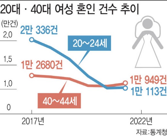 40대 초반 여성의 혼인 건수는 2021년에 이어 지난해까지 연속으로 20대 초반 여성의 혼인 건수보다 많았다.