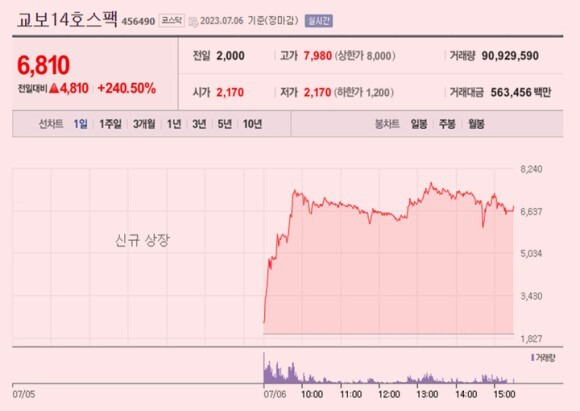 현재까지 일반 공모주는 5개나 "따따상"이 나왔는데, 기업인수목적회사(SPAC)는 작년 교보14호스팩이 장중 7980원... "따따상"에서 20원 부족한 못 찍었는데, 오늘 유진스팩10호가 도전중입니다... 장마감전에 매도하기는할건데 함 보죠... 스팩에서도 첫 따따상 나오는지 말입니다...