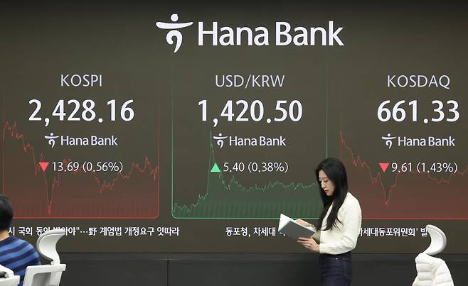 8일 한국거래소에 따르면 코스피는 지난주(2~6일) 전주 대비 1.13% 하락한 2428.16에 마감했다. 전날 윤 대통령에 대한 국회 탄핵소추안 표결이 의결 정족수 부족으로 무산됐다.