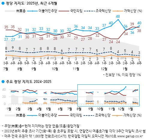 한국갤럽이 지난 21∼23일 전국 만 18세 이상 남녀 1천명을 대상으로 조사(95% 신뢰수준에 표본오차 ±3.1%포인트)한 결과, 1월 넷째 주 정당 지지율은 이같이 집계됐다.