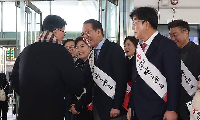 이 재명 더불어민주당 대표를 비롯한 당직자들이 설 연휴를 앞둔 24일 서울 서초구 반포동 고속버스터미널에서 설 귀성객에게 인사하고 있다.