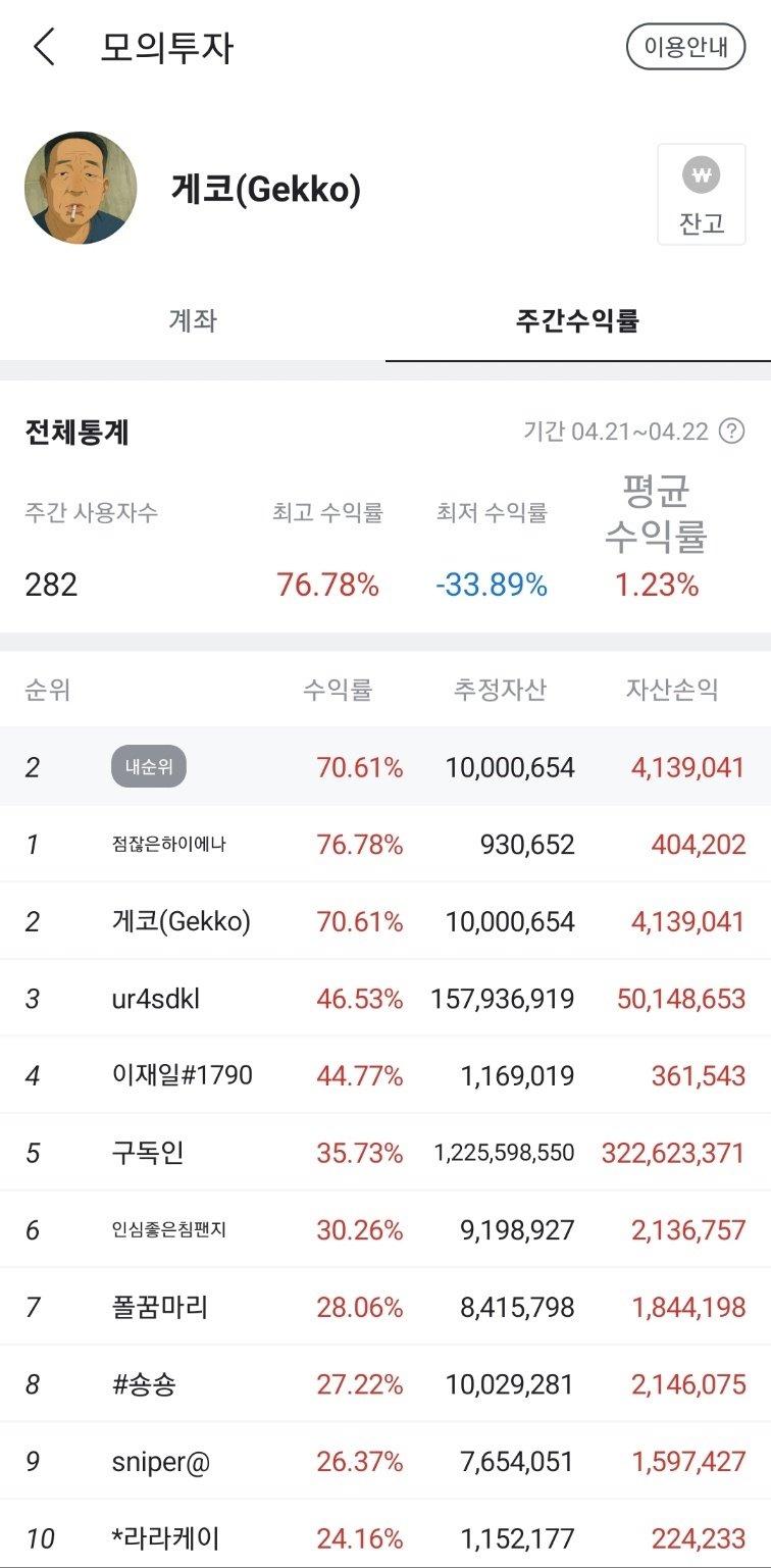 "그 초단기대박계획(MOAI) 대중형 이번주 연습상황... 주간 +100% 3주 연속 우상향 복리증진되는 계좌 잔고를 보여드리고 시작합니다... "변동성 로직 프로그램"(VLP)와 '직감분석기'(IAT)가 극한의 변동성과 무한대 쏠림의 출렁거리는 험한 장세에 아직은 불안정해서리~~^^ 새로운 대통령하에서 6월부터 하게 될 것 같네요~~~^^ 게코(Gekko)"