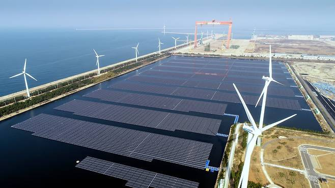 이 재명 더불어민주당 대선 경선 후보가 에너지 고속도로 구축과 재생에너지 확대 등을 담은 에너지 공약을 24일 내놨다. 이 후보는 재생에너지 확대를 강조하면서도 원전에 대해서는 별다른 언급을 하지 않아, ‘탈원전’을 밀어붙인 문재인 정부와는 차이가 있다는 평가가 나왔다. 사진은 문 재인 정부 때인 2018년 가동을 시작한 전북 군산의 수상 태양광 발전소.