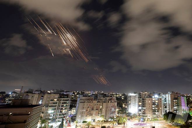 1일(현지시간) 이스라엘 아슈켈론 상공에서 하마스 수장 이스마일 하니예, 헤즈볼라 수장 하산 나스랄라 등의 암살에 대한 보복으로 이란에서 발사한 미사일을 이스라엘 방공망 아이언돔이 요격하고 있다. 2024.10.02