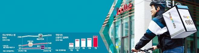 지난달 쿠팡이츠의 월간활성이용자(MAU)는 1146만 명으로, 1위 배민(2313만 명)과의 격차를 좁히고 있다. 한경에이셀에 따르면 쿠팡이츠의 월간 신용카드 결제액은 올해 1월 5861억원에서