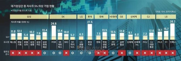 한국거래소 자료를 분석한 결과에 따르면 올해 6월 기준 ‘공시 대상 기업집단’(대기업집단)에 소속된 회사 중 자사주 비중이 5% 이상인 코스피 상장사는 총 55곳으로 조사됐다.