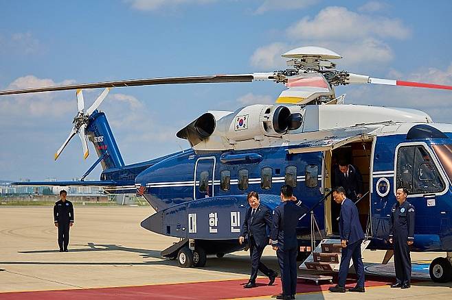 이 재명 대통령이 2025년 6월 25일 광주시민·전남도민 타운홀미팅 참석을 위해 광주공항에 도착해 전용 헬리콥터에서 내리고 있다.