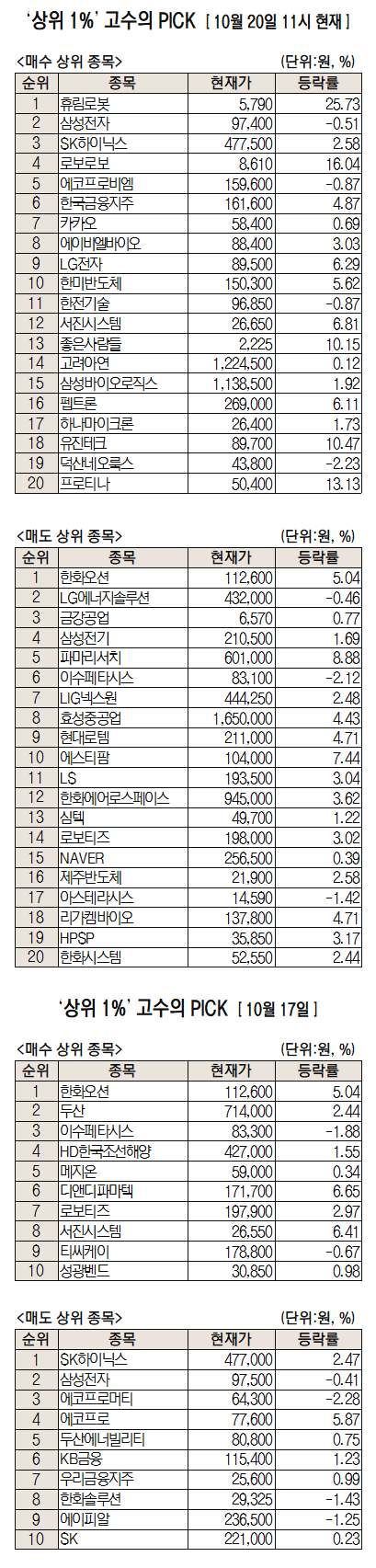 이날 미래에셋증권에 따르면 미래에셋증권 주식 거래 고객 중 최근 1개월간 투자 수익률 상위 1%에 해당하는 ‘주식 초고수’들이 오전 11시까지 가장 많이 사들인 종목은 코스닥 시장의 휴림로봇이다.