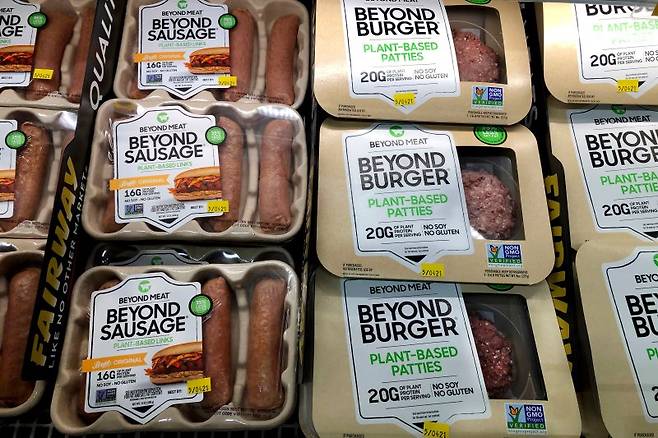 미국 식물성 대체육 업체 비욘드미트의 소시지, 패티 등이 2021년 4월 29일(현지시간) 뉴욕의 한 식료품점에 진열돼 있다. 비욘드미트 주가는 21일 폭등세를 이어가면서 이틀 사이 4배 넘게 폭등했다.