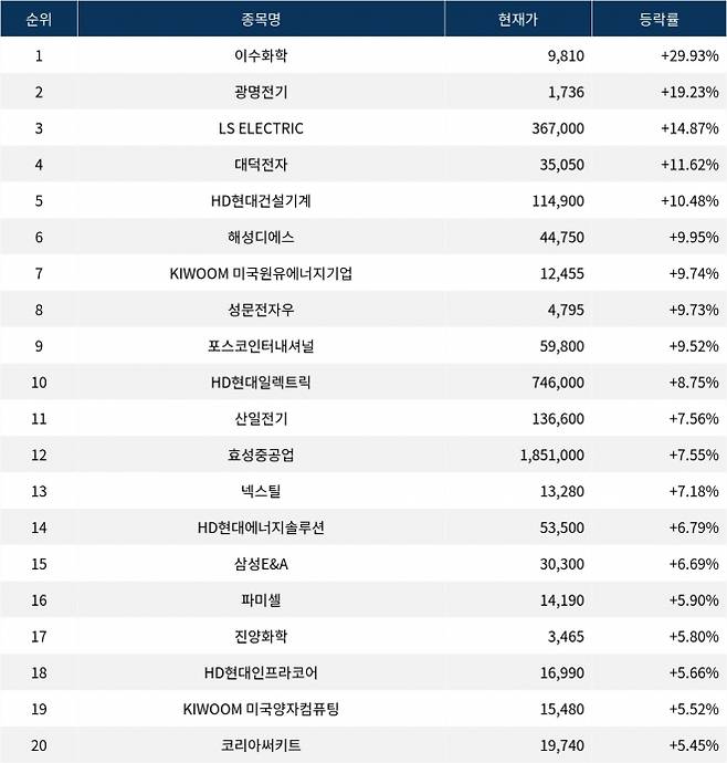 이밖에도 산일전기(062040) ▲7.56%, 효성중공업(298040) ▲7.55%, 넥스틸(092790) ▲7.18%, HD현대에너지솔루션(322000) ▲6.79%, 삼성E&A(028050) ▲6.69%, 파미셀(005690) ▲5.90%,