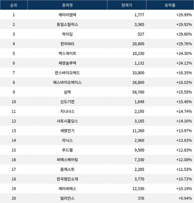[오늘-서울데이터랩]케이이엠텍 +29.99% 상승… 금일 증시 상승률 1위로 마감...