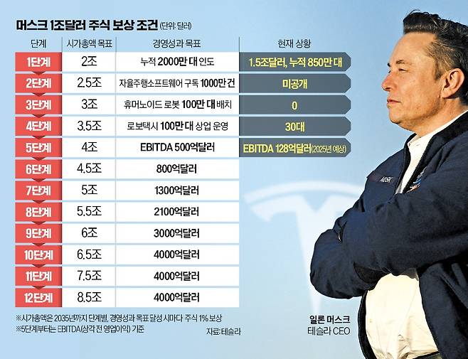 예컨대 현재 약 1조5000억달러 수준인 테슬라의 시가총액이 2조달러로 높아지고 운영 목표 중 하나인 ‘누적 차량 2000만 대 인도’를 달성하면 머스크는 주식을 받는다.