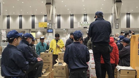 11월 26일 일본 도쿄도 고토구에 있는 도요스 중앙 도매시장 청과점에서 농산물 경매가 진행되고 있다.