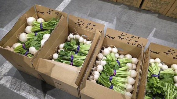 11월 26일 일본 도쿄도 고토구에 있는 도요스 중앙 도매시장 청과동 내 소포장된 무.