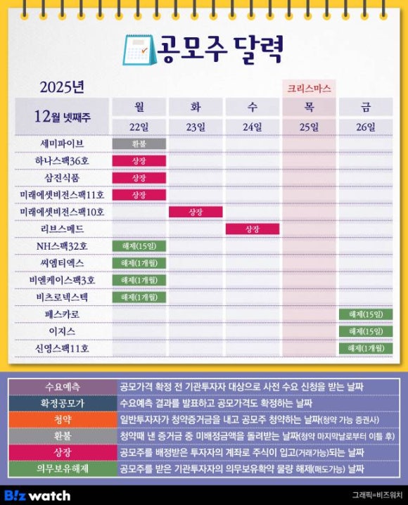12월 넷째 주 공모주 일정을 알아볼게요. 이번주는 연말인 만큼 청약 일정은 없어요. 대신 리브스메드와 삼진식품 두 곳이 코스닥 시장에 입성해요.