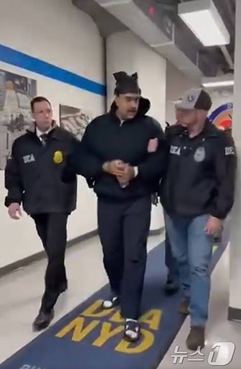 니콜라스 마두로 베네수엘라 대통령이 3일(현지시간) 미국 마약단속국(DEA) 요원에게 이끌려 이동하는 모습이 공개됐다.