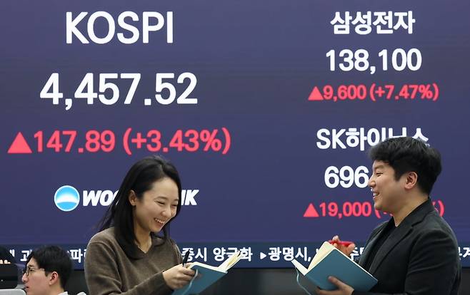 5일 코스피지수는 3.43% 급등한 4457.52에 거래를 마쳤다. 1.77% 오르며 시작한 코스피지수는 상승폭을 키우며 장중 고가에서 장을 마쳤다. 코스닥지수는 1.26% 상승한 957.50에 장을 마쳤다.