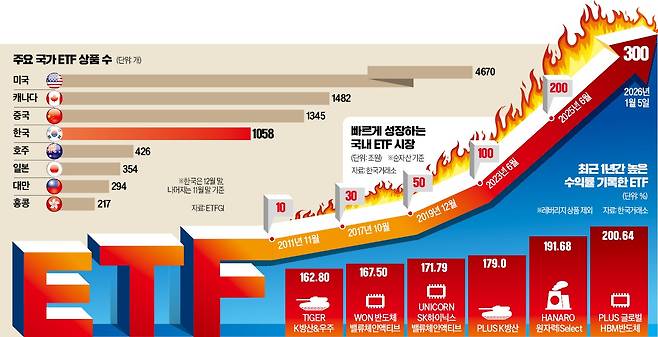 이후 2년 반 만에 300조원 시대를 열었다. 지난해에만 173개 상품이 신규 상장해 전체 ETF가 1058개로 늘었다. 국내 유가증권시장 상장사(958개)보다 100개 많다.