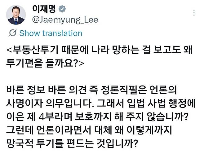 당신 부동산 투기 정말로 잡고 싶다면 진보쪽 박통되어야 합니다... 주요 SNS 장난질은 극우 꼴통들이나 하는거구요... 나라 판을 뒤집으시라고요... 그래야 망국적인 부동산 투기 잡고요... 없는 집 자식들 싼 가격에 집사고요...