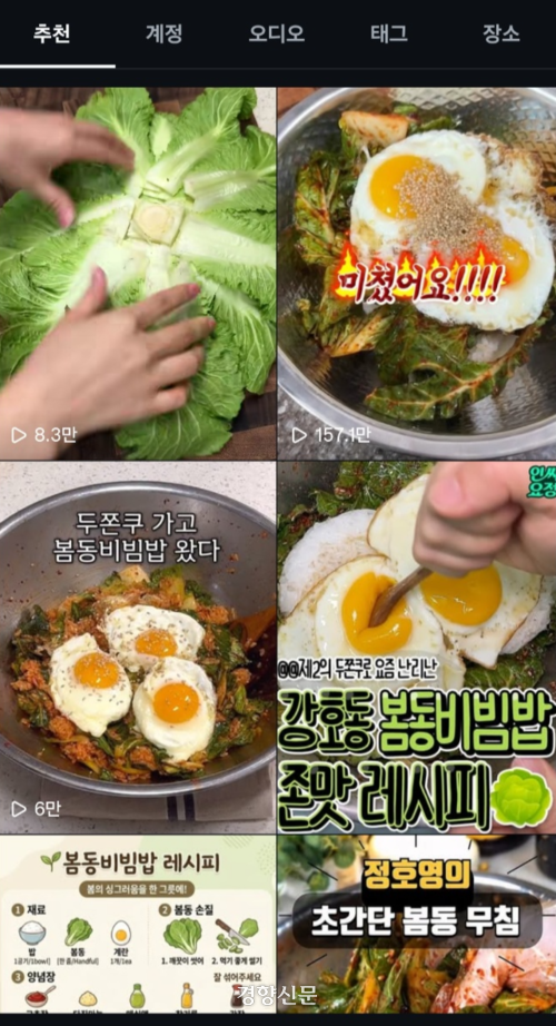 대부분 봄동비빔밥과 얼먹젤리를 맛있게 즐길 수 있는 ‘나만의 레시피’를 공개하는 게시물이다. 전통시장에서 봄동을 구하는 영상이나 얼려 먹기 좋은 젤리를 추천하는 영상도 많다.