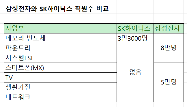 두 회사가 똑같은 영업이익 100조원을 낸다고 해도 삼성전자 직원 1인은 하이닉스 직원의 4분의 1의 성과급을 받게된다는 뜻입니다. 어째서 삼성전자 직원은 이렇게 많을까요?