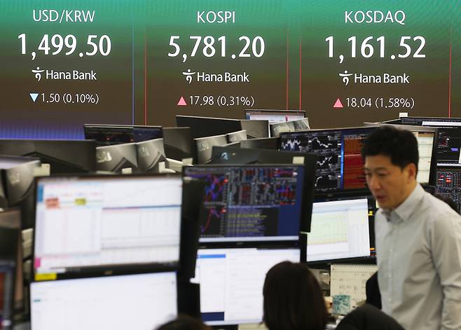 20일 서울 중구 하나은행 본점 딜링룸 전광판에 원·달러 환율과 코스피·코스닥 지수가 표시돼 있다. 이날 코스피는 전장보다 17.98포인트(0.31%) 오른 5781.20으로, 코스닥은 18.04포인트(1.58%) 오른 1161.52로 마감했다.