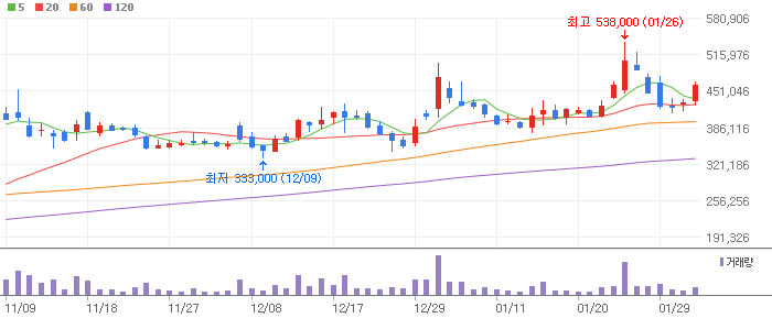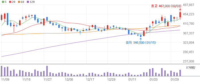 ( 최근 3개월간 SK케미칼의 일봉 그래프 )